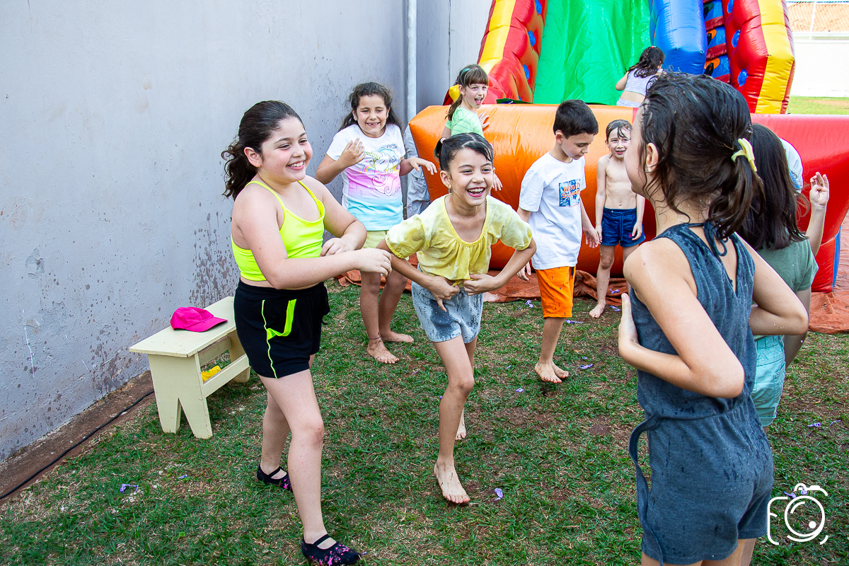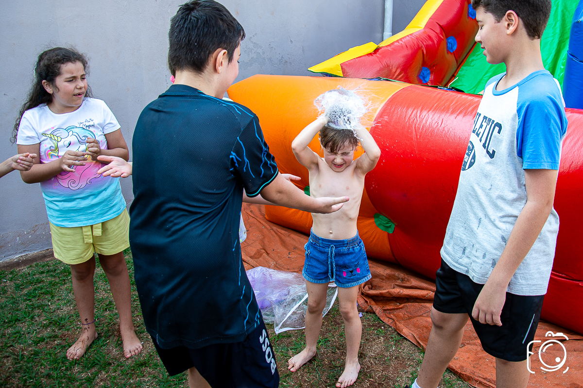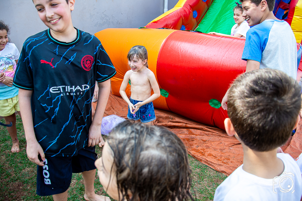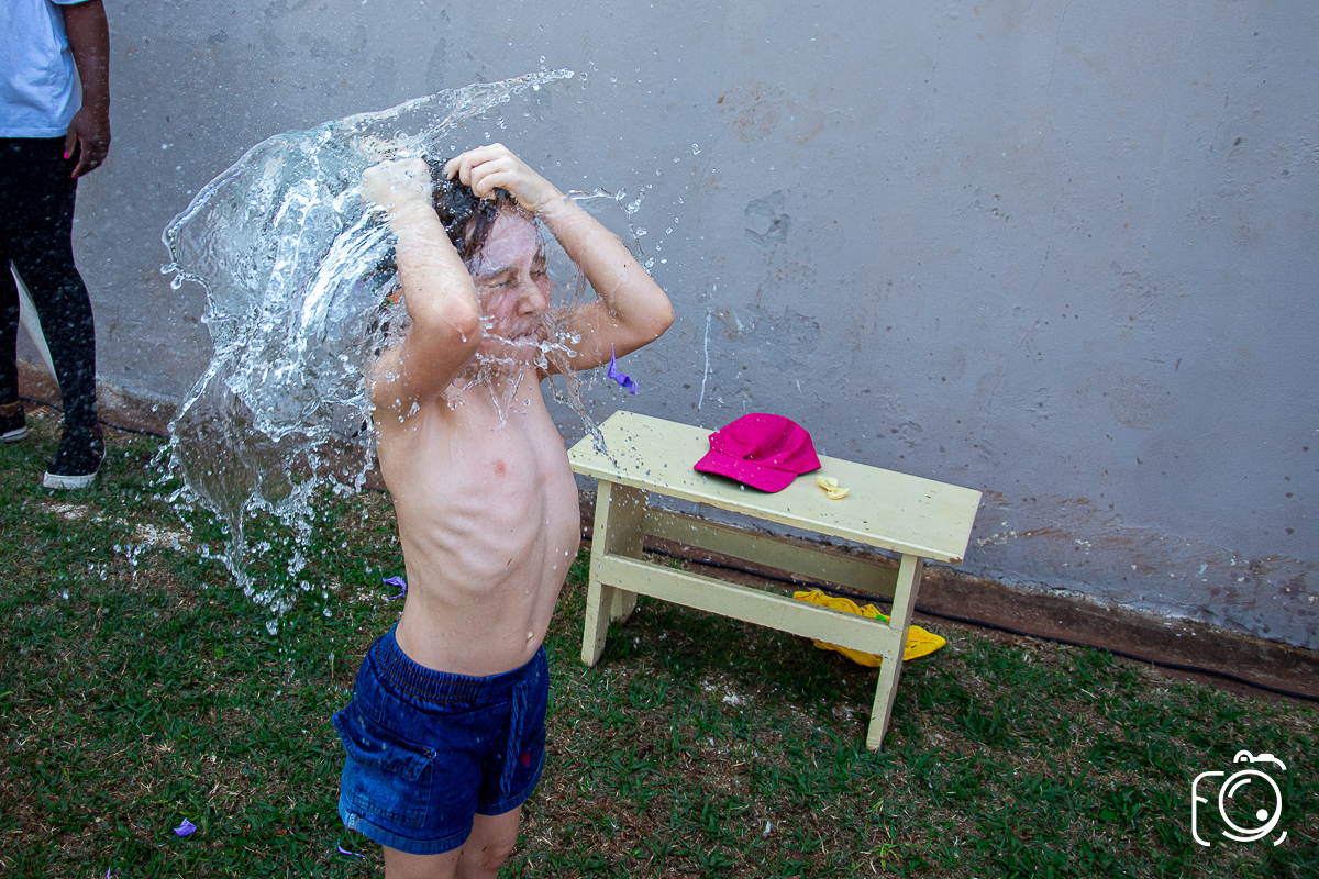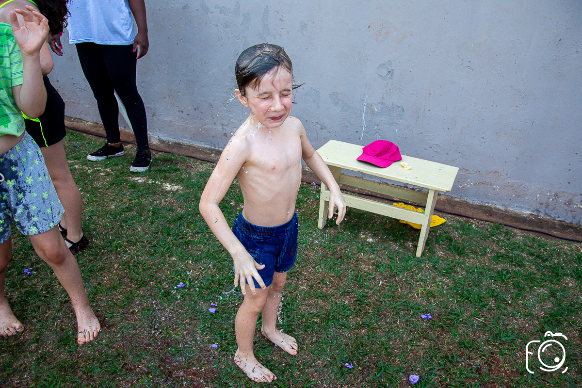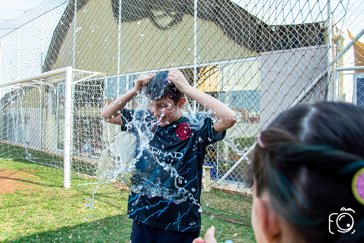 Que festa animadíssima! E aniversário do jeito que a criançada ama: calor, pé descalço, água, futebol, escorrega e muitas brincadeiras!