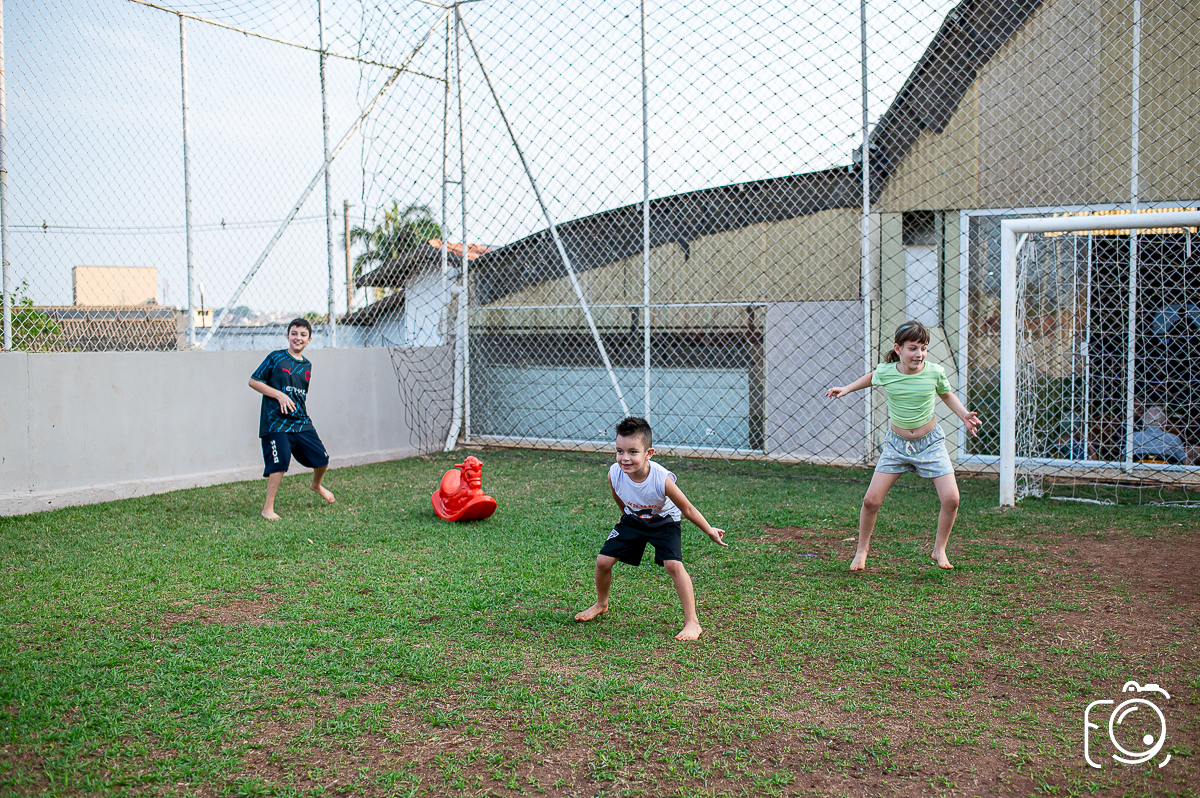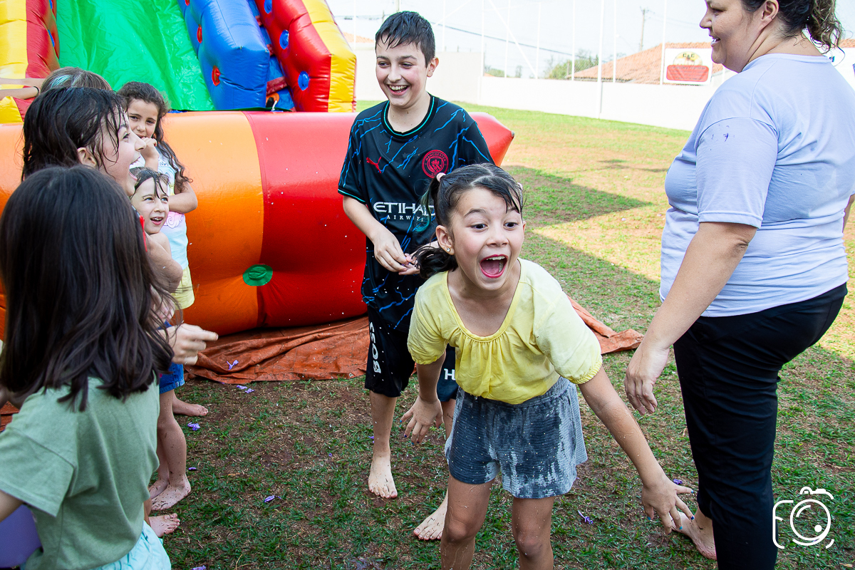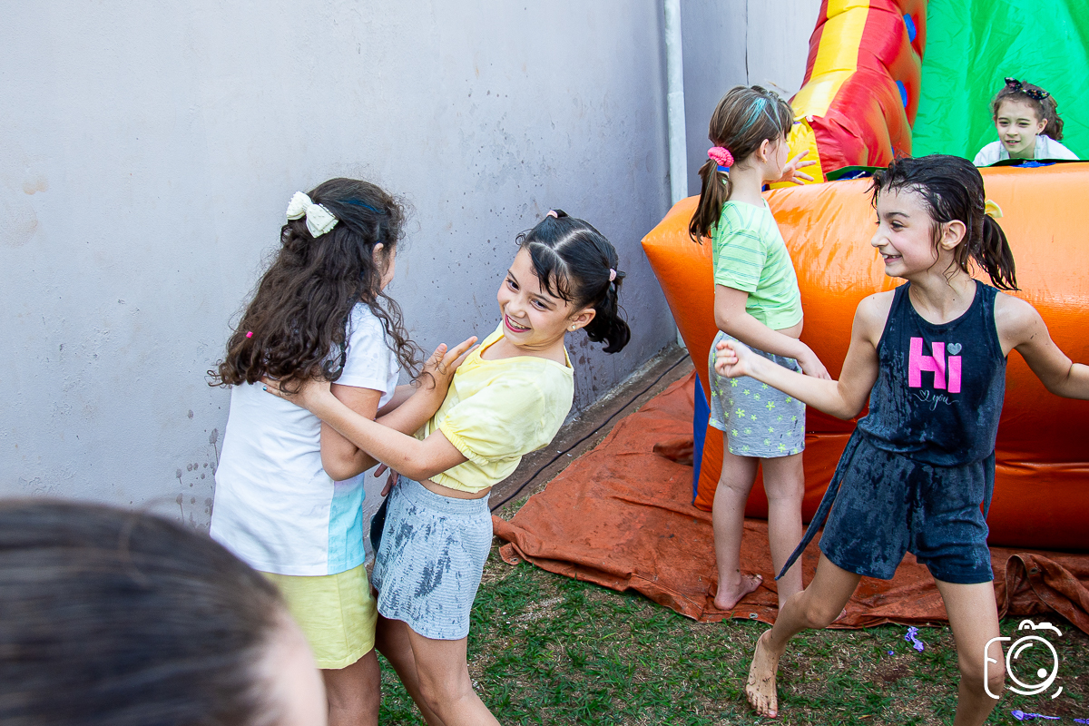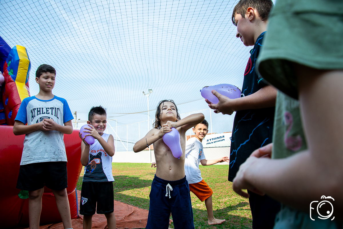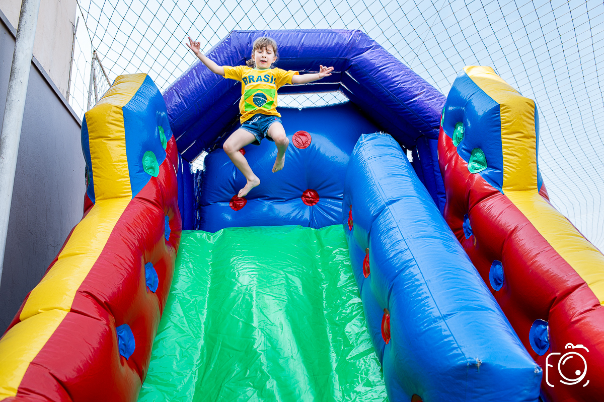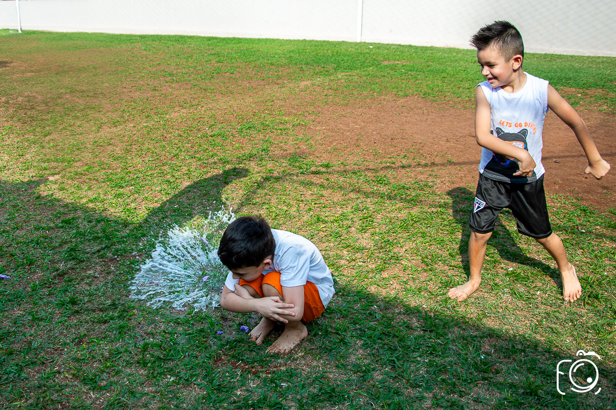 Que festa animadíssima! E aniversário do jeito que a criançada ama: calor, pé descalço, água, futebol, escorrega e muitas brincadeiras!