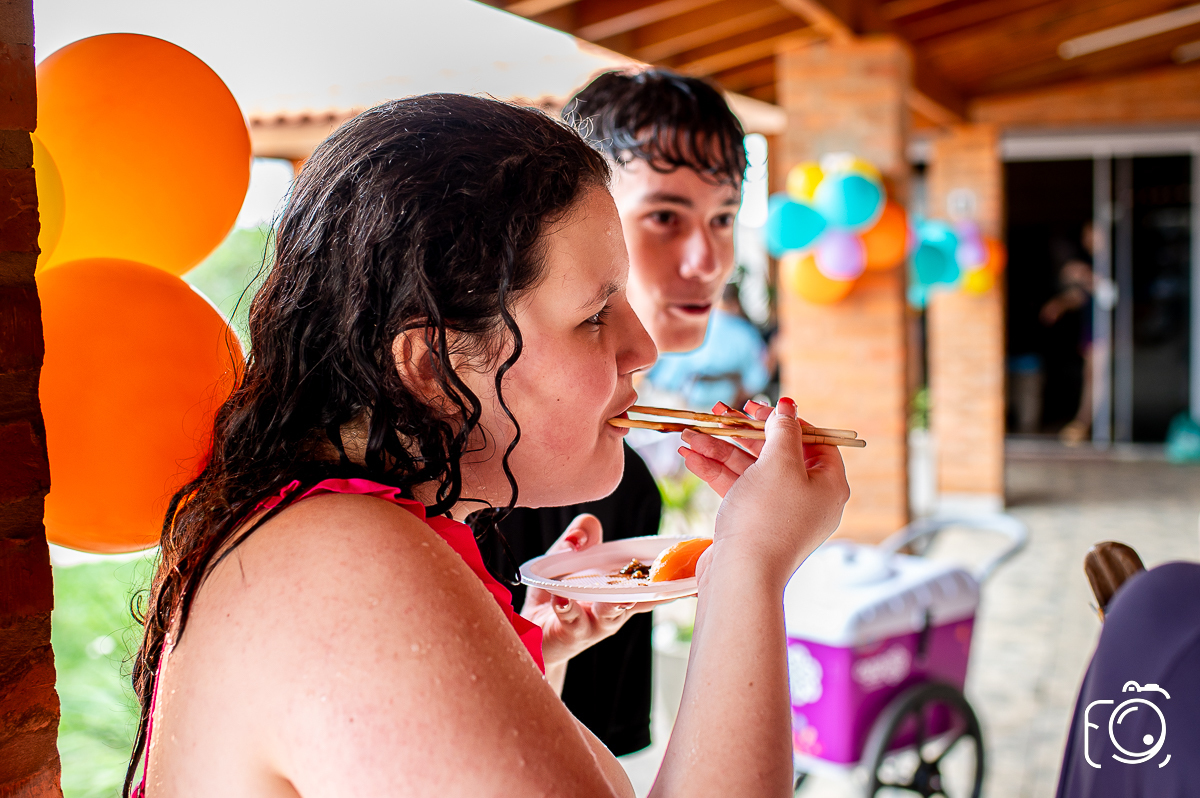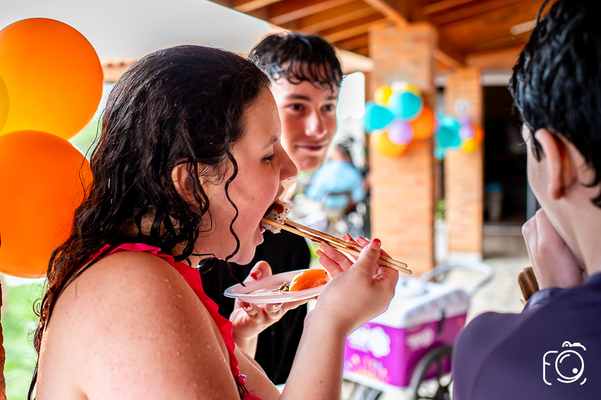 " Manu festejou os 15 anos do jeito que queria e disse que não queria uma festa de debutante normal. Os pedidos foram: piscina, futebol de sabão, sushi, sorvete, açaí, hambúrguer, hot dog, batata frita e tudo que ela gosta de comer!